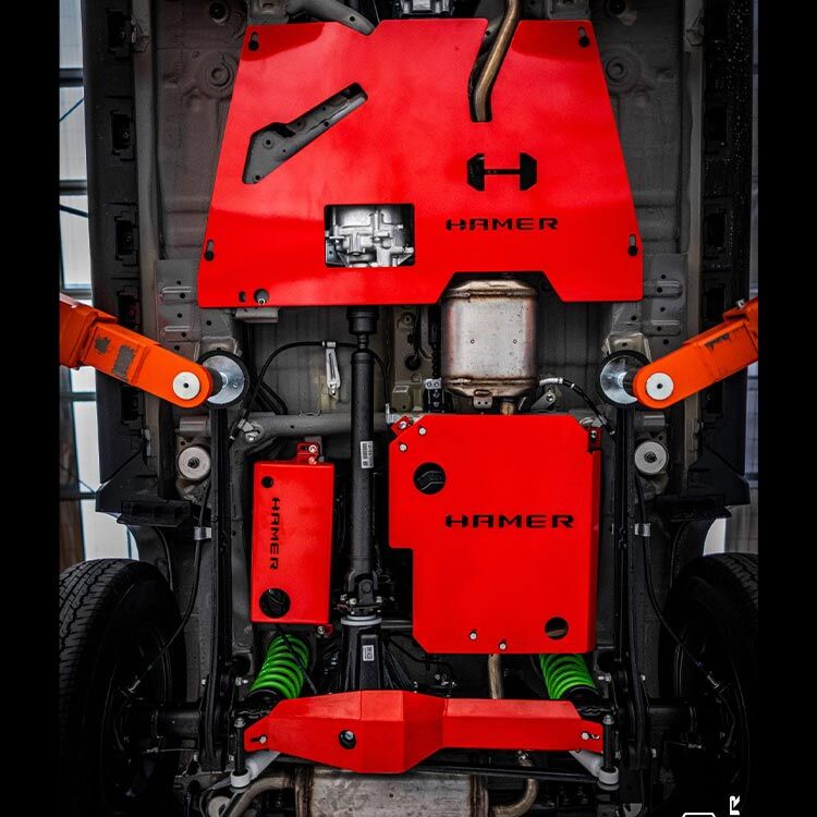 Underbody protection plates made of 3 mm high-grade steel plate are an example of Hamer's dedication to quality and longevity. Your vehicle will remain protected from even the most extreme weather thanks to the red powder-coated finish's strong corrosion resistance and striking appearance. Featuring a sleek design that enhances visibility, these plates are meticulously crafted to fit snugly without a Hamer bull bar, ensuring unobstructed access to crucial engine parts like the oil drain plug.