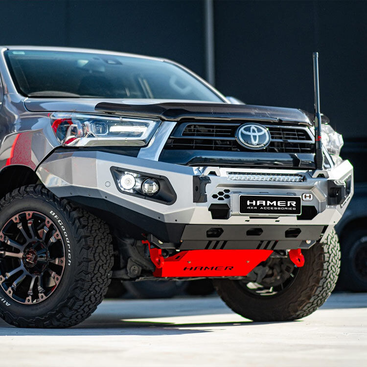 The Hamer 4x4 King Series Bullbar w/3.5T Recovery Points - No Flares is the perfect accessory to upgrade your 2024+ Toyota Hilux Revo Dual Cab. This whole bumper replacement was designed by Hamer with its primary purpose being to provide protection. Designed to protect your vehicle's sensitive front-end components from harsh terrain and obstacles, it will keep you safe across any environment without sacrificing handling or control.